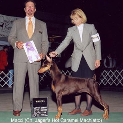In 2005 Jagerdobes produced their first litter, a litter of 9 bundles of joy! They were born on Easter morning and have proved a blessing to everyone involved since that day. “Heidi” had chosen the National/BIS winning “Hunter” (Ch. Cha-Rish Star Quest Blu-J’s) as her first husband and what a great choice that proved to be. From this litter came a BIS (Best In Show) winner, 2 group winners and a lovely dog that is close to his championship. These were the three best puppies in the litter and the only ones sold to show homes. “Heidi’s” most notable get from her “Hunter” cross is certainly “Macci”, (Ch. Jager’s Hot Caramel Machiato). Macci easily attained her championship in very limited showing, including garnering her first major as a young puppy being shown in the BBE ( Bred By-Exhibitor) class. After growing up a bit and with very few appearances in the specials ring “Macci” has already amassed a BIS/AOM at the National along with numerous group 1s! Macci wrapped up a very succesful specials career in 2009 with mulitple groups ones and back to back specialty wins under breeder judges Nancy Heitzman and Linda Krukar. Macci, laid to rest shortly before her 14th birthday.